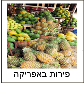בפעילות זו (מאת: ד"ר גלית בוצר), הילדים יכירו מגוון פירות הגדלים באפריקה ויעמדו על חשיבותם במטבח המקומי ובתזונה של אנשי היבשת.
